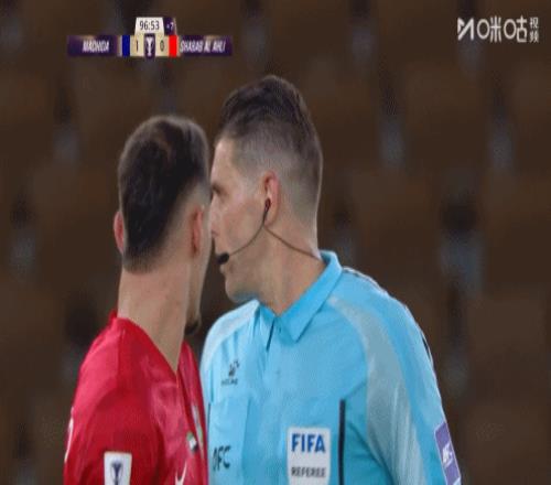 主裁親自查看回放取消進(jìn)球,迪拜國民球員圍住主裁抗議,主裁示意重新擲界外球??