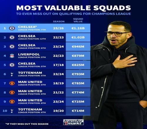 1. 切爾西 25-26賽季(未結(jié)束) 聯(lián)賽排名第7 11.6億歐元