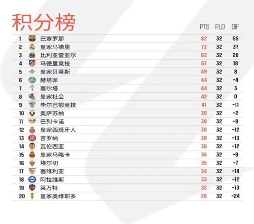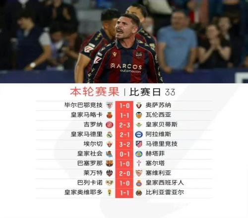 由于為上周末國王杯決賽讓路,西甲聯(lián)賽第32輪推遲至北京時(shí)間本周末進(jìn)行,第33輪聯(lián)賽提前上演。而北京時(shí)間今日凌晨,西甲第33輪最后三場比賽已結(jié)束。本輪皇馬和巴薩均小勝:皇馬主場2比1阿拉維斯,終結(jié)了近期不勝的低迷狀態(tài),巴薩則是1比0擊敗塞爾塔,豪取聯(lián)賽8連勝,繼續(xù)高歌猛進(jìn),目前巴薩領(lǐng)先皇馬9分;比利亞雷亞爾收獲一場平局,目前積62分,排名第三;馬德里競技繼上周國王杯決賽輸球后,本輪2比3爆冷負(fù)于保級球隊(duì)埃爾切,落后第三名已達(dá)5分。
