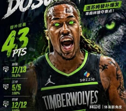 傷病無(wú)情,但賽場(chǎng)上的劇本卻往往充滿奇跡。奇兵道蘇姆在這場(chǎng)比賽中打出了封神之戰(zhàn),他出戰(zhàn)42分鐘,投籃17中13,三分球5中5,罰球更是12中12,不僅扛起了球隊(duì)的得分重任,還貢獻(xiàn)了4個(gè)籃板和2次助攻。43分的得分,不僅刷新了道蘇姆的職業(yè)生涯新高,更是近50年來(lái)NBA季后賽替補(bǔ)球員的最高得分!值得一提的是,道蘇姆原本差點(diǎn)與森林狼擦肩而過(guò)。