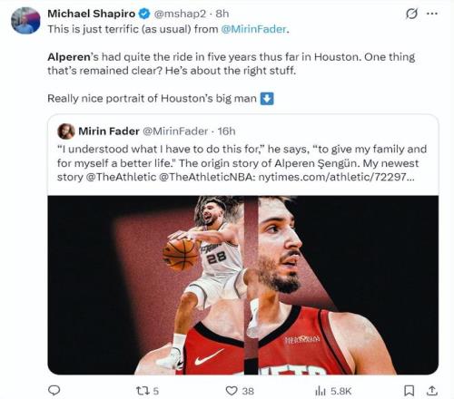 整個系列賽申京就是火箭最出色的那個,場均37.8分鐘,拿到22.8分10.2籃板4.8助攻2.25搶斷1.25蓋帽,命中率46.2%,隊記邁克爾-夏普瑞寫道:他一如既往的出色,申京在休斯頓這五年經(jīng)歷了不少波折,但有一點逐漸清晰,他確實具備出色的能力,休斯頓能擁有這位頂級的內(nèi)線大個子真的太棒了。