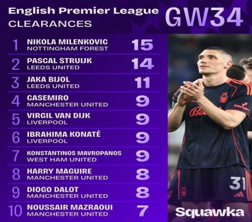隨著今天凌晨曼聯(lián)主場(chǎng)擊敗布倫特福德,本賽季英超第34輪的比賽也全部結(jié)束。北京時(shí)間4月28日,Squawka公布了英超第34輪球員解圍榜單。