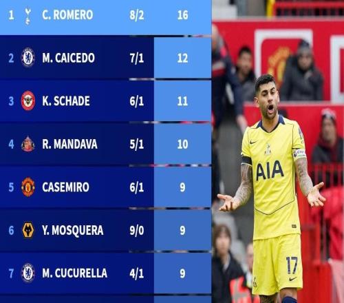本賽季英超紀(jì)律榜:克里斯蒂安羅梅羅8黃2紅得牌最多