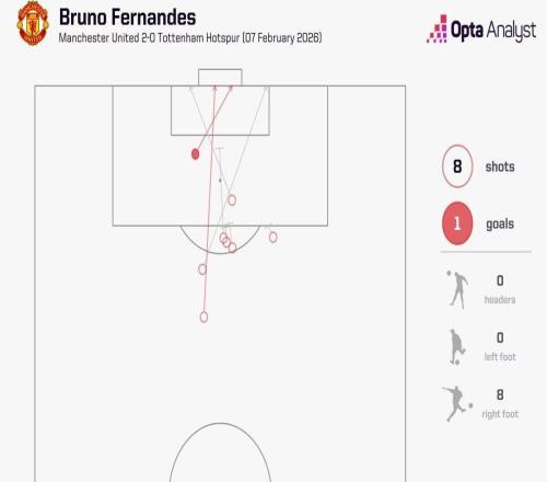 英超第25輪,曼聯(lián)主場(chǎng)2-0擊敗熱刺,本場(chǎng)比賽曼聯(lián)隊(duì)長(zhǎng)布魯諾-費(fèi)爾南德斯參與了14次射門,這是自2024年10月的薩卡以...