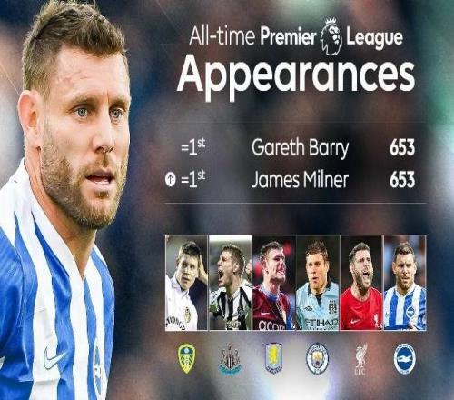 英超第26輪,布萊頓客場對陣維拉,上半場40歲的米爾納替補登場,迎來英超生涯第653次出場,追平英超歷史出場紀錄。...