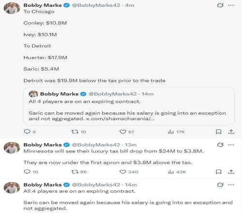 薪資結(jié)構(gòu)專家鮑比-馬克斯分析了這筆三方交易:艾維、赫爾特、康利、薩里奇都是到期合同,薩里奇再一次被交易了,他的合同是特殊條款不會進入?yún)R總的薪酬當(dāng)中。