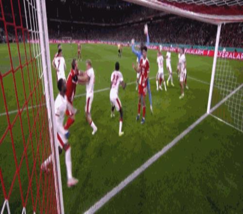 第9分鐘,有點滑稽,凱恩門前頭球攻門擊中隊友頭部