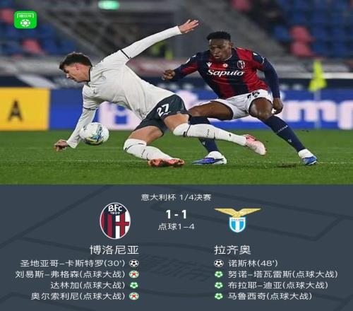 北京時間2月12日意大利杯 1/4決賽,博洛尼亞對陣?yán)R奧。博洛尼亞圣地亞哥-卡斯特羅破門。拉齊奧諾斯林破門。最終比分博洛尼亞 2-5 拉齊奧。