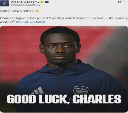 官方:阿森納宣布查爾斯-薩戈租借加盟瑞典俱樂部卡爾馬FF直到2027年1月。