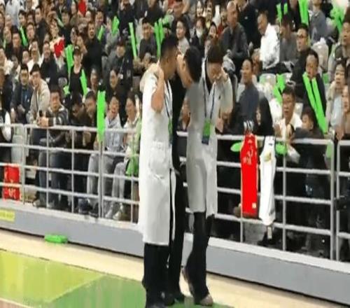 現(xiàn)場(chǎng)醫(yī)務(wù)人員立即上場(chǎng),34號(hào)裁判李津被兩位人員給攙扶離場(chǎng),去接受檢查與治療。