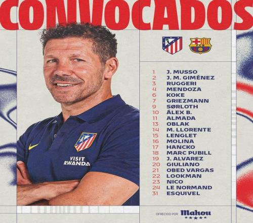 馬德里競技官方公布了國王杯半決賽首回合主場對陣巴薩的比賽大名單,格列茲曼領銜,瑟洛特回歸。