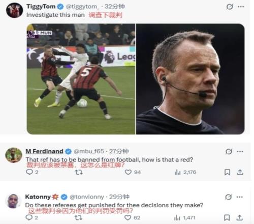曼聯(lián)球迷則在英超官方賬號下面留言,表示裁判應該被禁賽,要求徹查裁判。