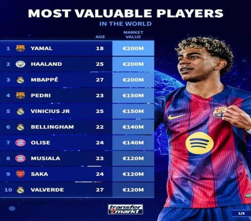 在更新多個(gè)聯(lián)賽身價(jià),德轉(zhuǎn)盤點(diǎn)當(dāng)前足壇身價(jià)TOP50。亞馬爾、哈蘭德、姆巴佩2億歐元領(lǐng)銜,20人身價(jià)過億歐元價(jià)值,意甲僅勞塔羅和伊爾迪茲進(jìn)入前50。
