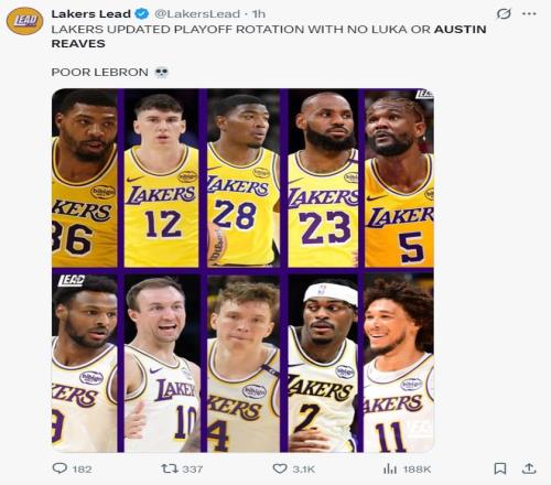 湖媒曬出了湖人隊季后賽的潛在輪換:先發(fā)斯瑪特、拉拉維亞、八村壘、詹姆斯、艾頓,替補布朗尼、肯納德、克內克特、范德比爾特、海斯。