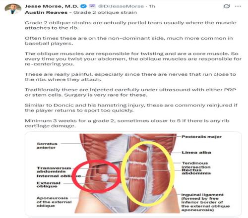 醫(yī)學專家Jesse More詳細的分解了里夫斯的傷情:腹斜肌二級拉傷,這種腹斜肌的拉傷是屬于部分撕裂,這種情況通常發(fā)生在肌肉與肋骨的連接處,這種情況多出現(xiàn)在非主導的一側,更多會出現(xiàn)在棒球運動員身上。