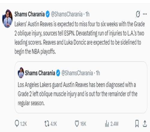 北京時間4月5日,根據(jù)ESPN名記Shams的報道,湖人隊的后衛(wèi)奧斯汀-里夫斯因為左側腹斜肌二級損傷,預計將缺席4-6周常規(guī)賽報銷。湖人的兩位頭號得分手接連遭遇傷病令人沮喪,里夫斯與東契奇都預計在季后賽開局階段缺席。