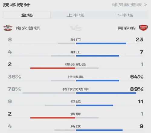 控球率64%,射門23比8,預(yù)期進(jìn)球1.77比1.21。阿森納把能占的優(yōu)勢(shì)全占了,唯獨(dú)沒占住比分牌。