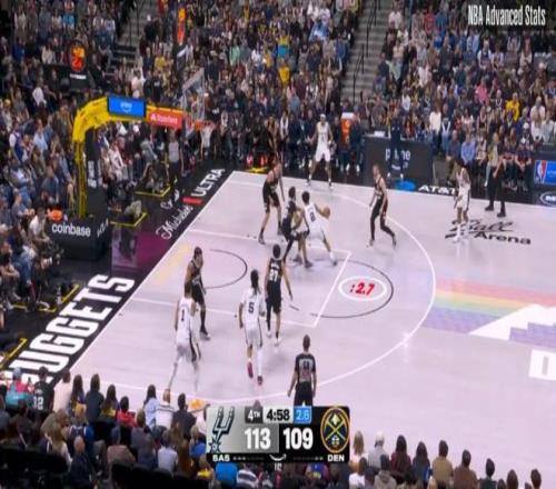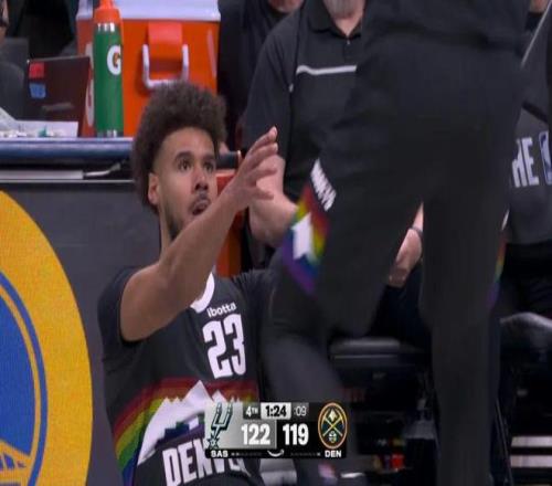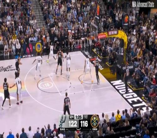 ——第四節(jié)剩下1分24秒前,掘金116-122落后馬刺6分,卡梅倫約翰遜接約基奇?zhèn)髑颍哆M三分并且造成??怂狗敢?guī)。