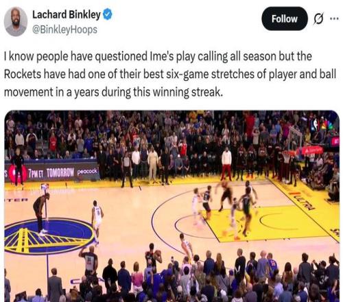 正如賽后火箭記者Lachard Binkley所說,整個賽季烏度卡的戰(zhàn)術(shù)水平都被質(zhì)疑,但就6連勝期間的表現(xiàn)來看,他們正在打出本季最好的跑位和運轉(zhuǎn)球。