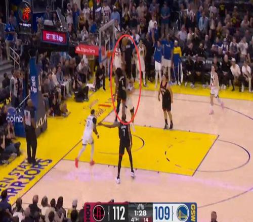 第三次漏判發(fā)生在距離比賽結(jié)束還有46秒時,勇士的格林在沒有積極防守對方球員的前提下,在己方禁區(qū)停留時間超過三秒,這是一次漏吹的防守三秒違例。這次漏判是火箭吃虧,勇士獲利。