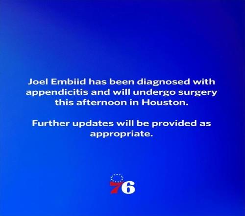 北京時間4月10日,費城76人隊球星中鋒喬爾-恩比德今日在休斯頓接受緊急手術(shù)。在這場常規(guī)賽關(guān)鍵戰(zhàn)對陣火箭前的幾個小時,他被確診為急性闌尾炎。