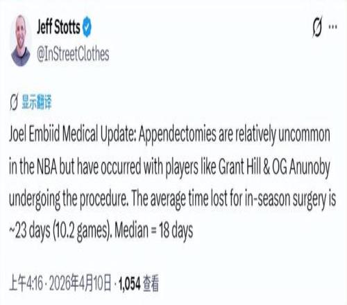傷病專家斯托茨表示,闌尾切除手術(shù)在NBA中相對少見,但也曾有球員經(jīng)歷過,比如格蘭特-希爾、OG-阿奴諾比都接受過該手術(shù)。賽季中進行此類手術(shù)的球員,平均缺陣約23天(對應(yīng)10.2場比賽),中位缺陣時間為18天。