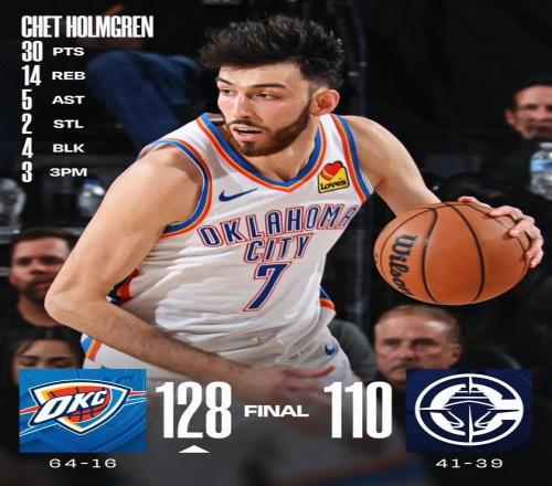 這場(chǎng)比賽,雷霆球星切特霍姆格倫打出了本賽季最佳之一:全場(chǎng)出戰(zhàn)31分鐘,投籃13中10,三分4中3,罰球10中7,得到30分14籃板5助攻。