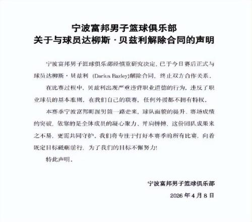 比賽第三節(jié)尚未結(jié)束,多家體育平臺(tái)已收到內(nèi)部消息;終場(chǎng)哨響18分鐘后,俱樂部官微同步推送解約公告,標(biāo)題直指核心:“關(guān)于立即終止與外援達(dá)柳斯·貝茲利合同的聲明”。