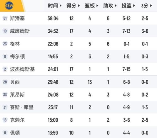 湖人本場隊內(nèi)MVP絕對是詹姆斯,41歲的老詹17投11中,砍下26分8板11助2搶斷1蓋帽,得分以及助攻均為全場最多,籃板僅次于搶到13板的貝西。艾頓21分5板,布朗尼10分。勇士這邊,首發(fā)球員梅爾頓表現(xiàn)辣眼睛,5中1,三分3中0,2分3板2助2失誤,堪稱隊內(nèi)最差。