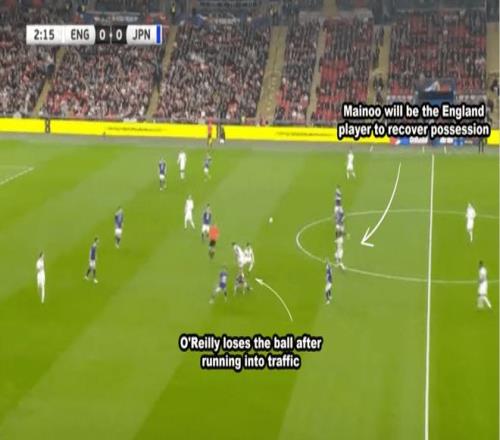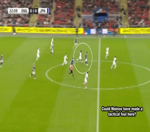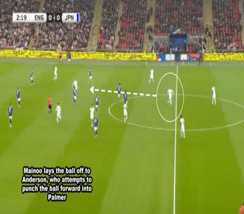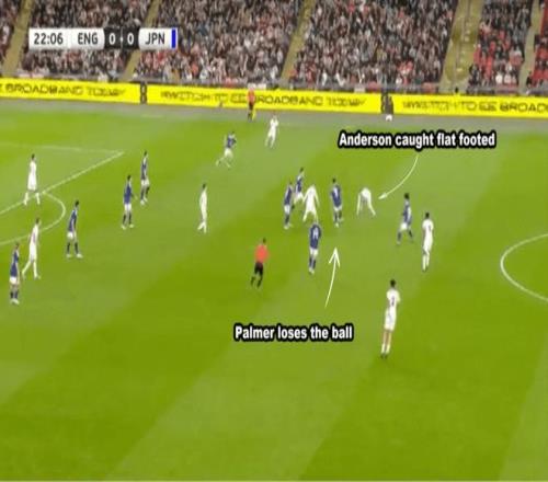 當(dāng)時(shí)科爾·帕爾默前場丟球,安德森失去了重心,未能及時(shí)鏟球阻止對方,而梅諾一如既往沒有跟人。日本打出反擊,并最終破門。