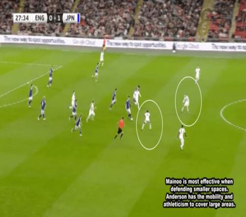 梅諾與安德森搭配時(shí),情況就跟在曼聯(lián)與卡塞米羅配合類似。梅諾居左,無球狀態(tài)下會向前逼搶,因?yàn)樗簧瞄L防守較小的區(qū)域;安德森在偏右位置殿后,負(fù)責(zé)大多數(shù)的防守任務(wù)。