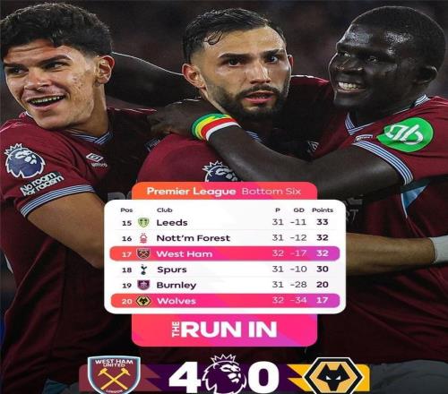 北京時(shí)間4月11日,英超第32輪一場備受關(guān)注的“保級大戰(zhàn)”打響。最終西漢姆聯(lián)在主場4-0大勝狼隊(duì),主場5輪不敗后,成功逃出降級區(qū)。而熱刺也在本輪未賽情況下,暫時(shí)跌入英超降級區(qū)。