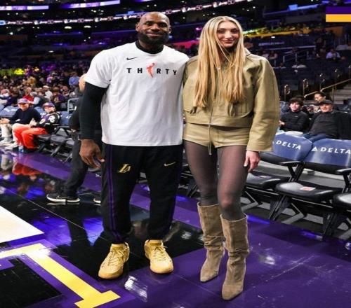 賽前,詹姆斯和火花球員布林克合影。值得一提的是,布林克便是勇士球星斯蒂芬-庫里的教妹。