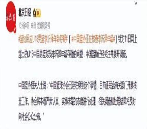 北京時間4月12日消息,中國籃球協(xié)會已就U18國青球員李沂澤年齡爭議正式回應,目前正聯(lián)合相關部門開展核查工作,承諾將本著嚴肅、實事求是的原則處理,并及時公布結果。