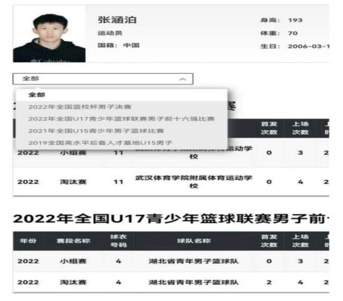 值得注意的是,張涵泊在2021-2022年仍以武漢體育學院附屬體校球員身份參加U17賽事,此后再無公開比賽記錄。而“武漢籃校(武體籃校)”與“武漢體育學院附屬體?!睂崬橥粰C構,隸屬武漢體育學院,兩球員所屬單位高度重合。