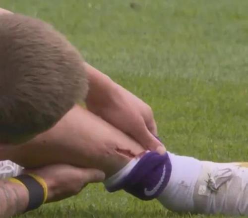 上半場比賽第34分鐘,霍爾特比被踢后倒地,隨后鏡頭中可以看到,他的小腿出現(xiàn)一道長長的血口,之后霍爾特比被換下場。