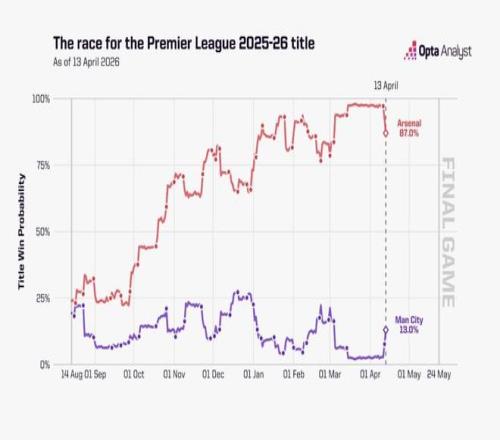 據(jù)Opta數(shù)據(jù)機構(gòu)報道,阿森納雖遭遇爭冠危機,但剩余賽程占優(yōu)、強強對話記錄出色、防守數(shù)據(jù)冠絕英超等因素,讓模型仍將其視為奪冠頭號熱門,奪冠概率高達87%。