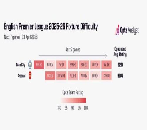 但從更廣視角審視雙方剩余賽程,阿森納仍占優(yōu)勢。根據(jù)Opta實力評分,阿森納剩余對手的平均評分為90.4,而曼城對手為92.0。相比聯(lián)賽其他球隊,阿森納剩余賽程難度位列第四輕松。只要能在伊蒂哈德避免失利,主動權(quán)仍在自己手中,尤其是他們還剩三個主場。