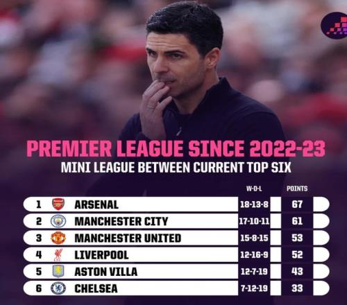 更重要的是,阿爾特塔治下的阿森納在強強對話中的整體戰(zhàn)績令人印象深刻。過去三個半賽季,在目前排名前六球隊的相互交鋒中,阿森納輸球最少(39場僅8負),積分最高。如果說存在某種規(guī)律,那就是阿森納往往在預(yù)期必勝的比賽中丟分,而非在對陣直接競爭對手時失手。