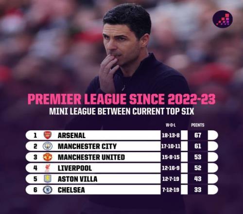 另外在阿爾特塔治下,阿森納對壘英超排名前六的戰(zhàn)績也是相當(dāng)不錯(cuò),過去3個(gè)半賽季39次交鋒僅輸?shù)?場,是所有球隊(duì)中表現(xiàn)最好的。通常情況下,阿森納似乎更容易在“應(yīng)該能贏的比賽”中跌倒,而不是在與直接競爭對手的較量中失利。