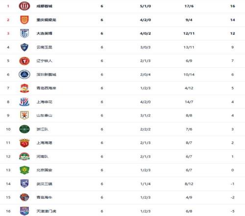 在積分榜上,成都蓉城以16分繼續(xù)領(lǐng)跑,重慶銅梁龍以14分排名第2位,大連英博以12分排名第三位。