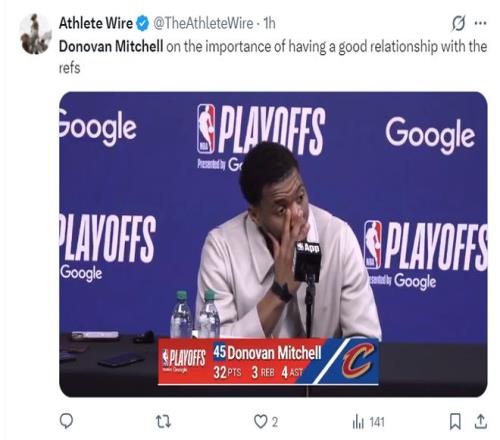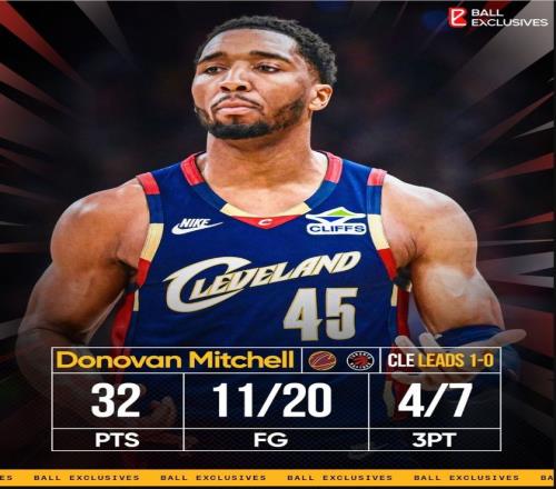 騎士大勝猛龍拿到季后賽首輪G1的勝利,多諾萬-米切爾在這場比賽中僅僅登場30分鐘,20中11,三分7中4,罰球7中6,拿到32分4助攻3籃板2搶斷4失誤,命中率55%,三分命中率57.1%,真實命中率69.3%,正負(fù)值+16。