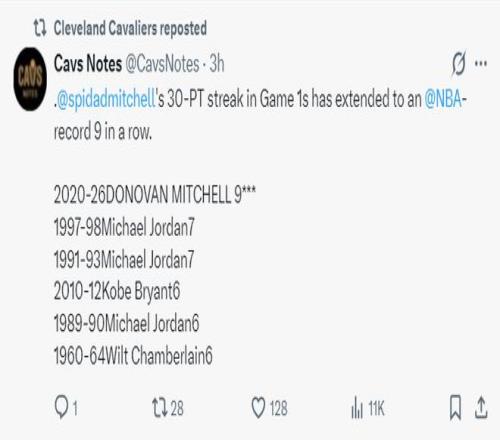 3.上一次系列賽G1連續(xù)達(dá)成至少7次30+的球員是10-12的科比,米切爾與科比都是13順位;