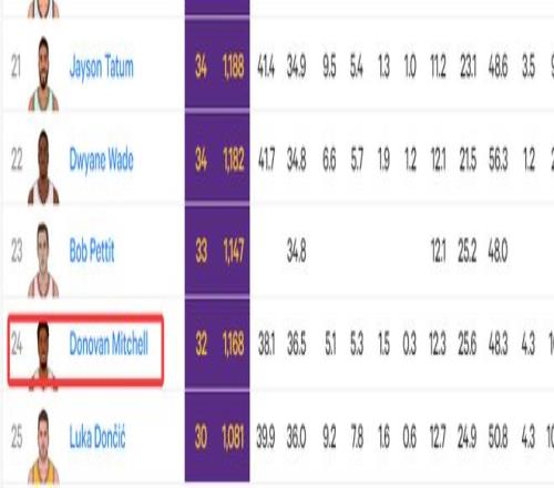 5.米切爾季后賽32次30+排在歷史第24位,東契奇30次第25位;