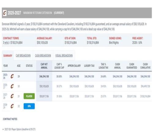29歲的米切爾本賽季的常規(guī)賽場均33.5分鐘拿到27.9分4.5籃板5.7助攻1.5搶斷0.3蓋帽,命中率48.3%,三分命中率36.4%,他還剩兩年合同,但27-28賽季是球員選項。他今夏有資格跟騎士達(dá)成一份四年2.77億的超級頂薪提前續(xù)約,騎士會給他這份均薪高達(dá)6925萬的超級頂薪嗎?