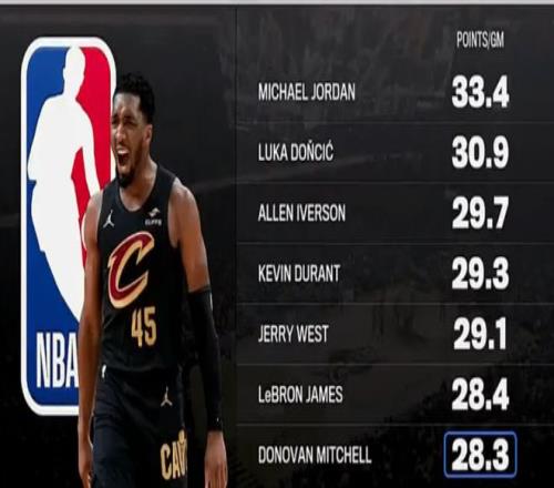 6.NBA歷史季后賽場均得分排名米切爾28.3分第七,詹姆斯28.4分第六;