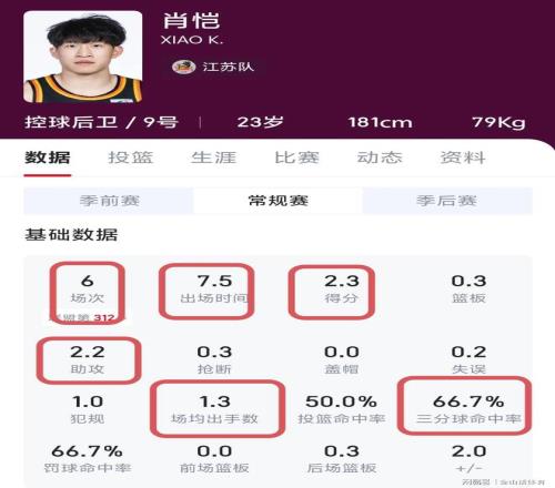 作為CBA一年級生,肖愷在加盟江蘇隊(duì),出場機(jī)會并不多,本賽季只出場了6次,場均只有7分鐘上場時(shí)間,平均1.3次出手機(jī)會,場均得分為2.3分,但能送出2.2次助攻,特別是他的三分命中率,達(dá)到恐怖的66.7%,外線堪稱“百步穿楊”。