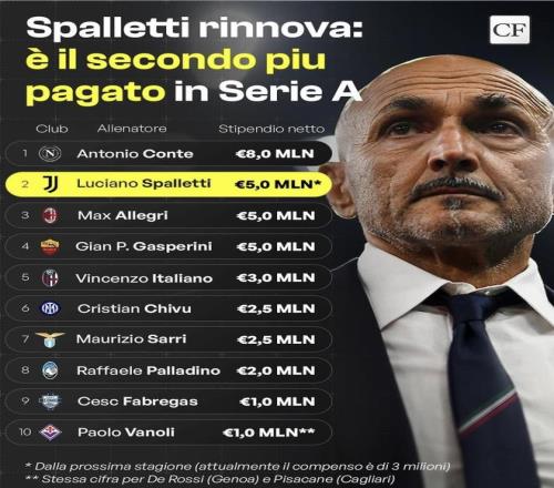 但最大的爭(zhēng)議出現(xiàn)在斯帕萊蒂身上。 去年10月他接手尤文時(shí),年薪還是300萬(wàn)歐元的級(jí)別。就在4月10日,尤文官方突然宣布和他續(xù)約到2028年,意媒普遍確認(rèn)新合同年薪直接破500萬(wàn),把他強(qiáng)行抬進(jìn)了薪資第二梯隊(duì)。尷尬的是,尤文現(xiàn)在31輪只拿到57分排在第五,目前的成績(jī)根本撐不起這漲出來(lái)的幾百萬(wàn)。尤文這波操作,更像是在為未來(lái)兩年的重建提前砸錢畫(huà)餅,而不是為眼下的戰(zhàn)績(jī)買單。