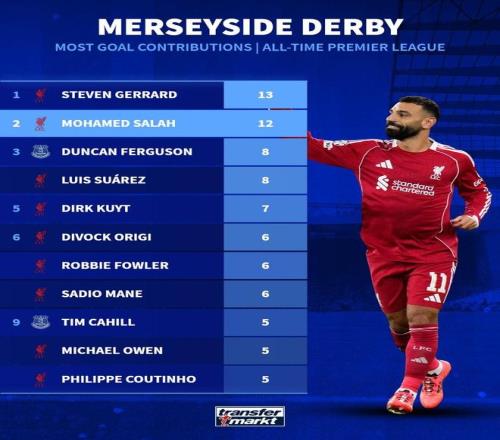 賽后德轉列出了英超默西塞德德比歷史上直接參與進球數(shù)最多的11名球員,薩拉赫以12球位列第二。