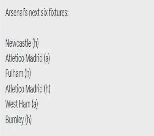 阿森納未來(lái)6場(chǎng)比賽:主戰(zhàn)紐卡斯?fàn)?、客?zhàn)馬競(jìng)、主戰(zhàn)富勒姆、主戰(zhàn)馬競(jìng)、客戰(zhàn)西漢姆、主戰(zhàn)伯恩利。